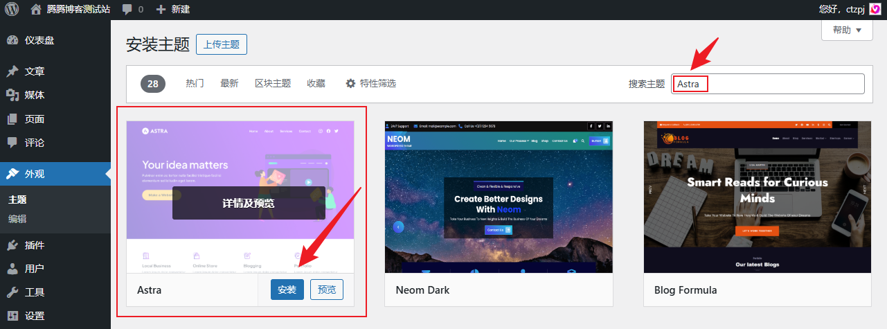 登录 WordPress 后台,点击 外观 -> 主题 -> 添加新主题,搜索 Astra。 点击 安装激活