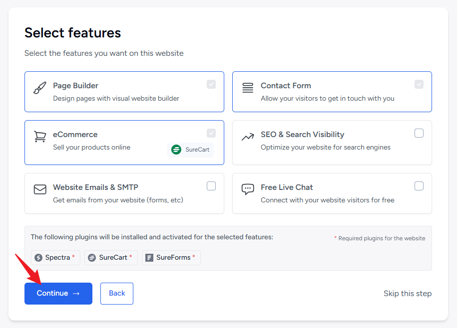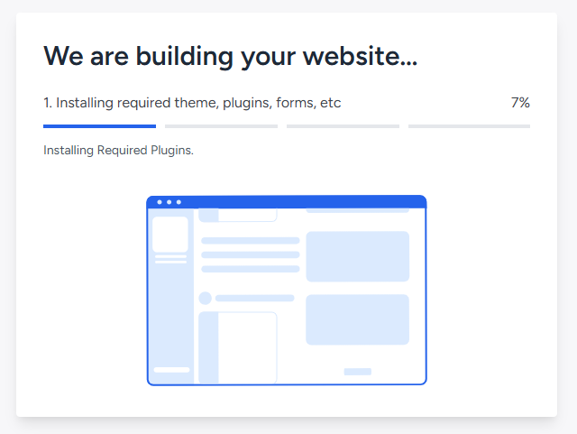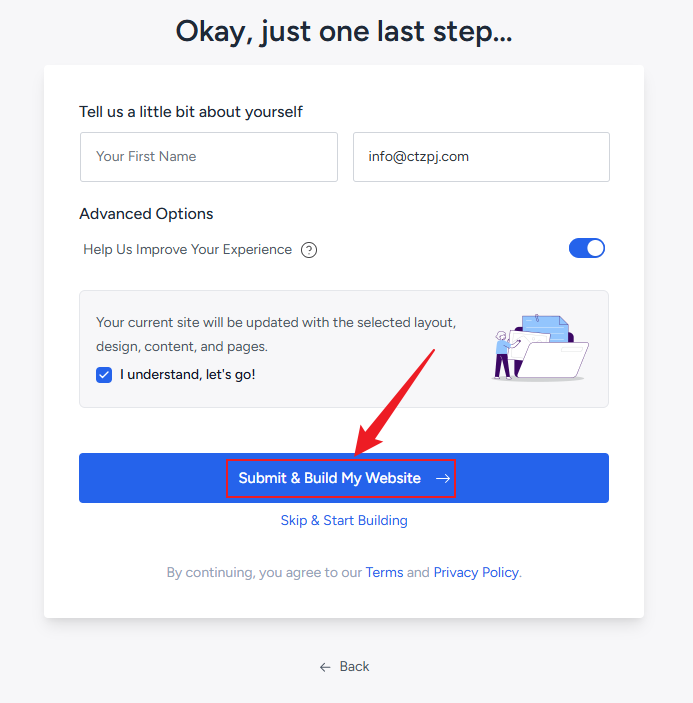 点击 Submit & Build My Website 提交并安装我的网站,当然您也可以点击下方的 Skip & Start Building (跳过开始安装网站)
