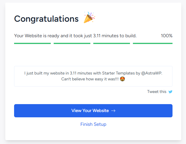 如果出现以下界面说明您的模板已经导入成功了。您可以点击View Your Website 来查看您的网站前端页面。如果导入过程中出现报错,建议还原备份后重新导入。