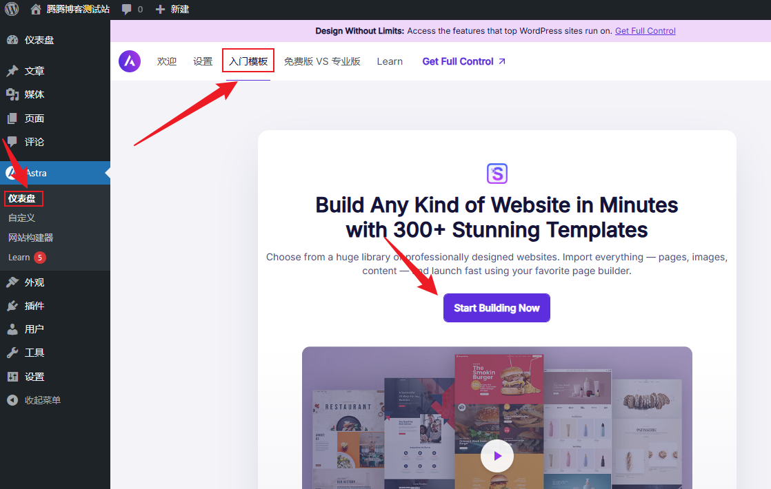 2. 点击 入门模板 -> Start Building Now