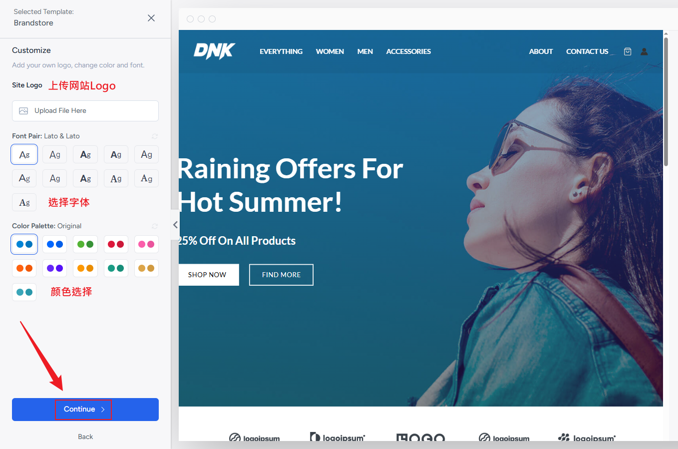 定制,这里您可以上传自己的Logo 选择字体、颜色,左侧选择右侧预览。当然如果你准备后期修改的话这里可以保存默认,让我们继续。