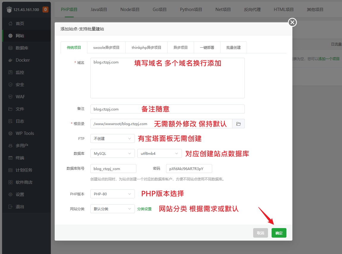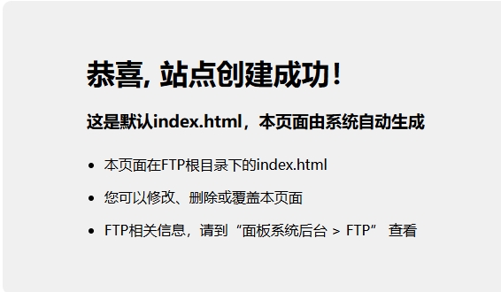 怎么在宝塔面板里面添加网站 在我们搭建完宝塔面板和网站环境,并且 解析好域名后,我们就可以正式开始搭建网站了。 宝塔面板添加网站教程 宝塔面板添加网站是非常简单,只需要在“网站”标签里面点击“添加站点”,然后填写上对应的内容就可以了!如图: 一、填写已解析好的域名 在“添加网站”页面中,在域名栏填写你已完成解析的域名,建议格式如下:ctzpj.comwww.ctzpj.com每行一个域名,便于后期设置 301 重定向 和 SSL 证书。 二、创建数据库 勾选“创建数据库”,系统会自动生成数据库名、用户名和密码。安装 WordPress 时需要用到,请务必保存好这些信息。 三、FTP 可不用创建 当前网站管理基本不依赖 FTP(宝塔面板就更不依赖了),建议不勾选创建 FTP,避免不必要的端口暴露和资源浪费。 四、点击确认提交 点击【确认】后,系统将弹出提示窗口,包含数据库账户、密码等关键信息。 五、访问域名并验证网站是否添加成功 打开你绑定的域名,例如:https://blog.ctzpj.com 如果看到以下页面,说明网站创建成功,下一步即可开始部署 WordPress 程序。 如果你想在服务器上安装多个网站,只需要重复上面的操作,再次添加域名绑定即可。 下面我们就可以进行WordPress的部署安装了! 详情请点击查看:宝塔面板安装WordPress网站教程