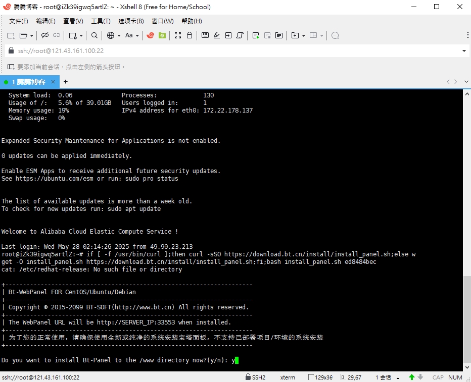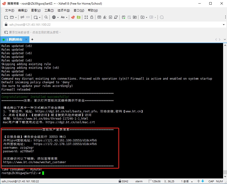 宝塔面板安装教:在 VPS 上安装宝塔面板,新手也能轻松管理服务器! 你是否刚刚购买了 VPS,却不知道该如何开始搭建网站或部署程序?别担心,今天就带大家一步步学会如何在自己的 VPS 上安装 宝塔面板! 宝塔面板是一款强大又易用的服务器运维管理工具,特别适合新手使用。它可以帮助你可视化管理网站、数据库、防火墙、SSL 证书等,让 VPS 操作像使用电脑软件一样简单直观。 文章目录 Toggle 安装宝塔面板准备工作安装宝塔面板图文教程安装网站环境 安装宝塔面板准备工作 1、我们在安装宝塔面板前,需要您有一台VPS主机,如果你还没有VPS主机的话,请点击这里查看:高性能VPS推荐,购买一台VPS备用。 2、然后需要下载 XShell 软件来管理 VPS ,下载地址点击:免费的VPS管理软件Xshell8/Xftp8中文版下载 3、如果您还不会使用 XShell 来连接您的 VPS 服务器的话,那么您可以查看:Xshell8连接VPS服务器教程 4、注册一个免费的宝塔账号,后面需要用的到。点击这里注册宝塔(网站右上角免费注册) 安装宝塔面板图文教程 1、打开xShell 软件,连接到您的 VPS 服务器 小提示:当出现[root@xxx ~]#这样的提示后,就代表登录成功了。 2、安装宝塔面板,需要您复制下面的命令并粘贴到命令窗口,回车继续 if [ -f /usr/bin/curl ];then curl -sSO https://download.bt.cn/install/install_panel.sh;else wget -O install_panel.sh https://download.bt.cn/install/install_panel.sh;fi;bash install_panel.sh ssl251104 当出现下面图片中这段内容的时候,输入y然后回车。 Do you want to install Bt-Panel to the /www directory now?(y/n) 安装将持续几分钟,正常2-3分钟,等待安装完成即可! 出现下图界面则代表您已经成功的安装了宝塔面板! 红色方框里面的三行分别是你宝塔面板管理地址、管理账号和管理密码。你可以用鼠标选中后右键复制,然后把信息保存到电脑上。安装完成后宝塔将自动为您分配面板的端口,如上图分配了 33553 端口! 特别提醒:后台登录地址一定记得保存好,33553/后面的内容也需要记住才能登录后台。 实在是忘记了地址就参考宝塔面板忘记后台登录网址怎么办 如果宝塔面板密码忘记可查看:宝塔面板忘记密码如何修改 3、您可以通过外网ipv4面板地址访问您的宝塔面板!如果访问面板出现下图错误则表示您可能未在服务器端放行端口。 那么您将需要到服务器的后台(防火墙或者安全组)开放分配的端口!协议TCP ,IPv4选择所有IP(可以保证您在任何地方都正常访问您的宝塔面板),端口号宝塔分配的端口号:33553 开放端口后继续使用浏览器访问外网ipv4面板地址即可 4、使用浏览器打开外网面板管理地址,会出现宝塔登录地址。 点击高级继续访问。 如果你要自己修改宝塔面板的账号密码,就登录宝塔面板后左边选择“面板设置”,下面的面板用户和面板密码处修改。 安装网站环境 注意,安装完毕宝塔面板不代表你就可以安装网站了,你还需要安装网站环境。 默认你第一次登录宝塔面板就会出现下面这张图片。 新版本宝塔登录后需要强制登录宝塔账号,所以自己去注册一个宝塔账号然后登录即可。 如果您是打算搭建WordPress独立站那么选默认的,选择LNMP这边的一键安装,如果你是1G内存及以上用户,建议php版本选择php 8以上,MySQL选择5.7,如果您需要安装Ftp则需要如上图全部勾选 其他保持默认。 当一切安装完毕后,就可以创建网站了,请点击查看:宝塔面板如何搭建安装WordPress 网站