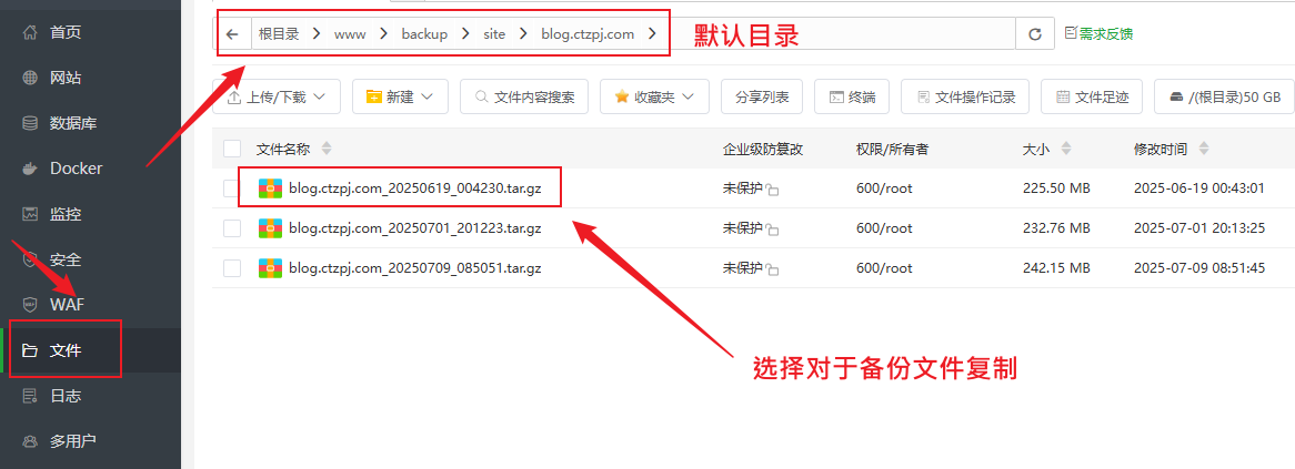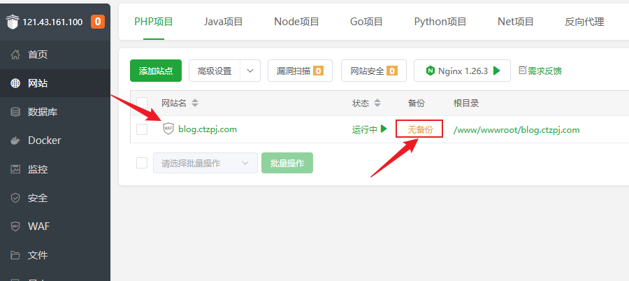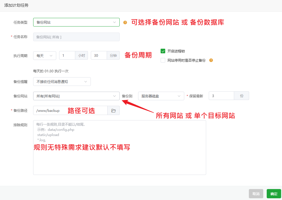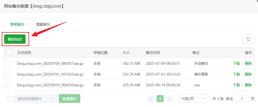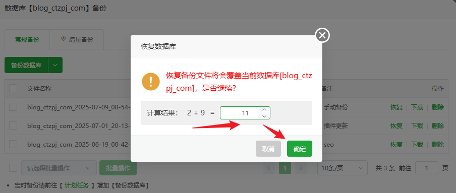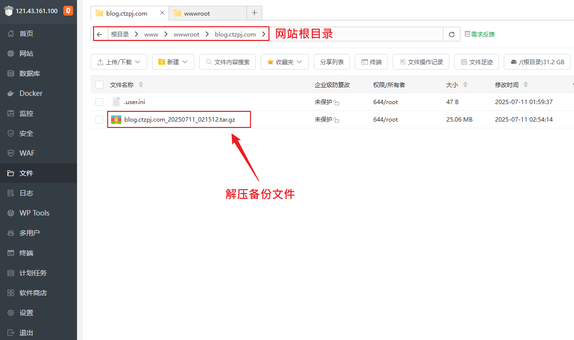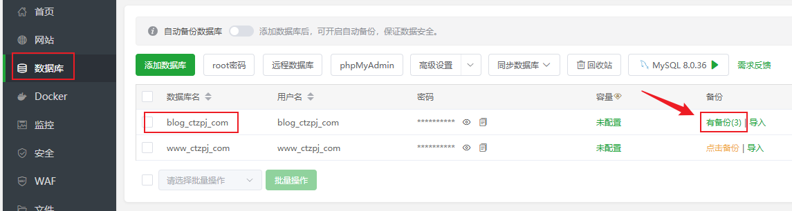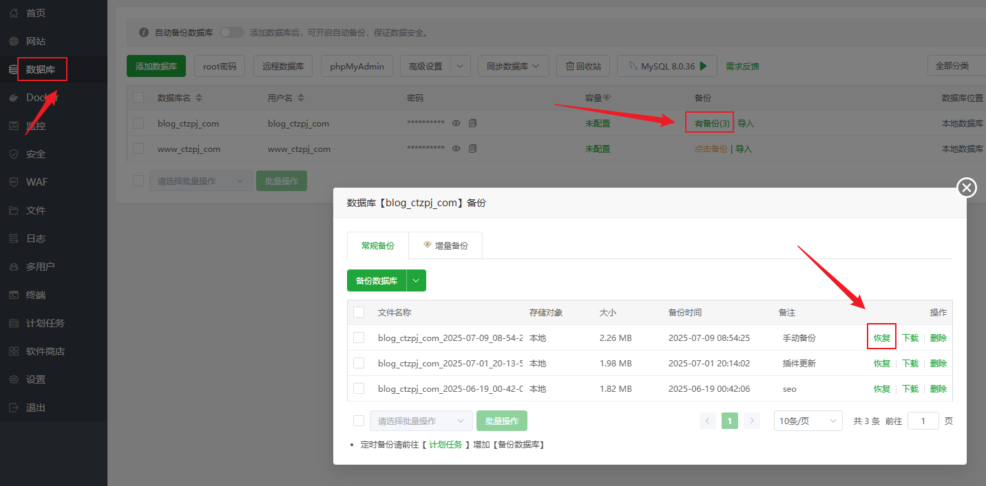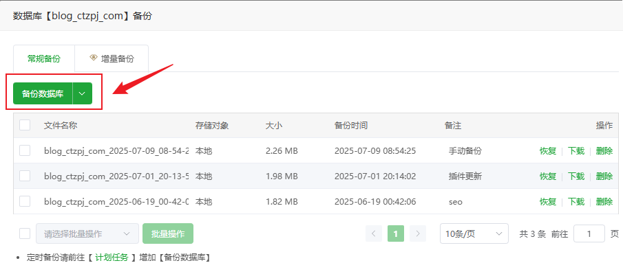 宝塔面板网站备份与恢复教程:数据库+网站文件操作指南 文章目录 Toggle 为什么要备份网站?图文教程手动备份教程备份网站文件步骤:备份数据库步骤:自动定时备份设置(推荐)步骤:如何恢复网站(还原备份)一、恢复网站文件二、恢复数据库小贴士 为什么要备份网站? 在在我们搭建好WordPress网站后或者运营过程中,将会面临诸如程序更新、插件冲突、黑客攻击、误操作等风险,定期备份是保障网站数据安全的最后防线。宝塔面板作为国内最常用的服务器管理面板,内置了非常方便的 网站与数据库备份功能。 相关教程:如果您还不会安装宝塔面板可以查看:如何在 VPS 主机上安装宝塔面板 图文教程 一个网站通常包含两部分关键数据:网站文件:HTML/PHP 文件、插件、主题、图片等静态资源数据库:网站的文章、用户、设置等动态数据推荐同时备份网站文件与数据库,避免数据不一致问题。 手动备份教程 备份网站文件步骤:1、登录宝塔面板2、点击左侧菜单【网站】,找到要备份的网站 3、点击备份下方的按钮“无备份/有备份” 4、进入“备份/恢复”选项卡5、点击【备份】按钮 说明:备份完成后,文件将保存在 /www/backup/site/网站名/ 目录下 备份数据库步骤:1、点击左侧菜单【数据库】2、点击备份下方的按钮“无备份/有备份” 3、找到目标数据库,点击“备份” 4、系统将自动生成 .sql 备份文件说明:备份文件默认保存在 /www/backup/database/数据库名/ 目录 自动定时备份设置(推荐) 宝塔面板提供“计划任务”功能,可定期自动备份网站文件和数据库。步骤:1、点击左侧【计划任务】2、点击【添加任务】 3、选择任务类型为:网站备份 或 数据库备份4、选择对应的网站或数据库5、设置备份周期(建议:每日 / 每周)6、设置保留的备份数量7、保存任务 说明:需分别添加网站备份和数据库备份2个计划任务 如何恢复网站(还原备份) 恢复网站(还原备份)时需要同时恢复网站文件和数据库文件!一、恢复网站文件1、进入默认备份目录:文件将保存在 /www/backup/site/网站名/ 目录下2、找到目标网站的备份文件 → 复制到网站根目录 2、回到网站根目录: /www/wwwroot/网站名/ 目录下 → 删除了备份外的所有文件 → 留下备份文件 → 解压备份文件 为了节省服务器磁盘空间,建议解压后删除复制到网站根目录的备份文件!请勿离开还未恢复完成! 二、恢复数据库1、进入面板左侧【数据库】菜单2、点击备份下方的按钮“无备份/有备份”3、找到对应数据库 → 点击“恢复” 4、选择要恢复的对应备份文件的 .sql 文件 → 确认还原 恢复后建议清除缓存并测试网站前端功能是否正常。小贴士最好每日备份一次,并设置保留最近 7 天数据备份文件请及时下载保存或同步至云端,防止误删或硬盘损坏建议在网站大改动或升级前执行一次手动备份相关文章:高性价比的VPS主机推荐宝塔面板忘记后台登录网址怎么办宝塔面板忘记密码如何修改宝塔面板如何添加网站如何在宝塔面板上安装WordPress网站