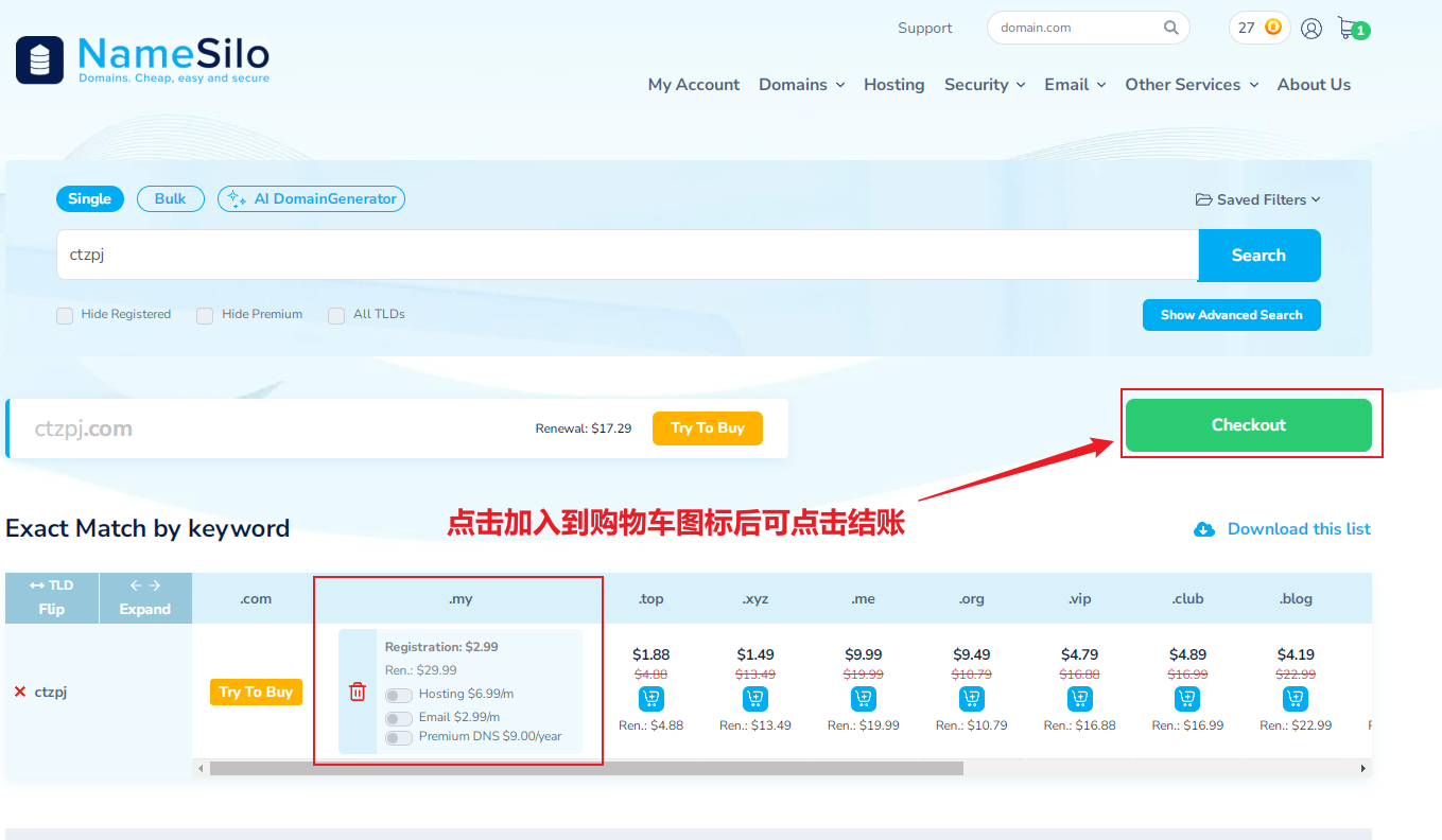 选择可以注册的域名(如果不满意又重新搜索其他域名即可),点击购物车按钮后,接着点击绿色结账按钮。