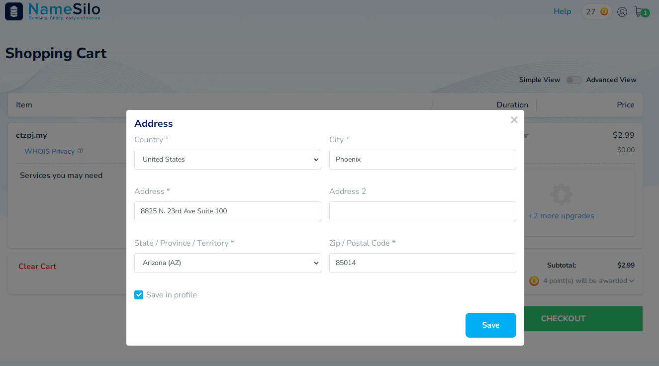 点击结账按钮后会出现域名地址信息,如果您还没有填写则需要补全信息!