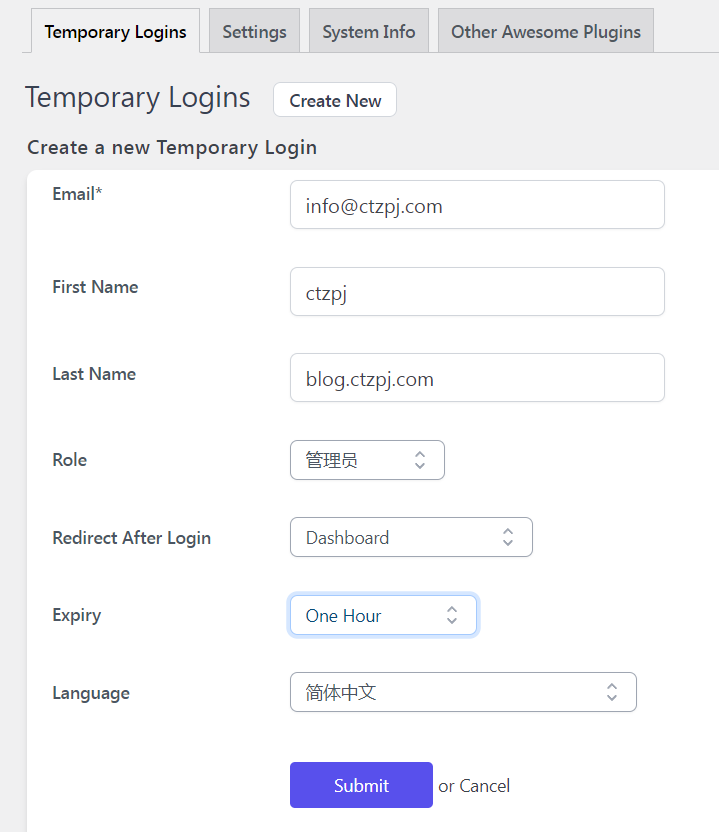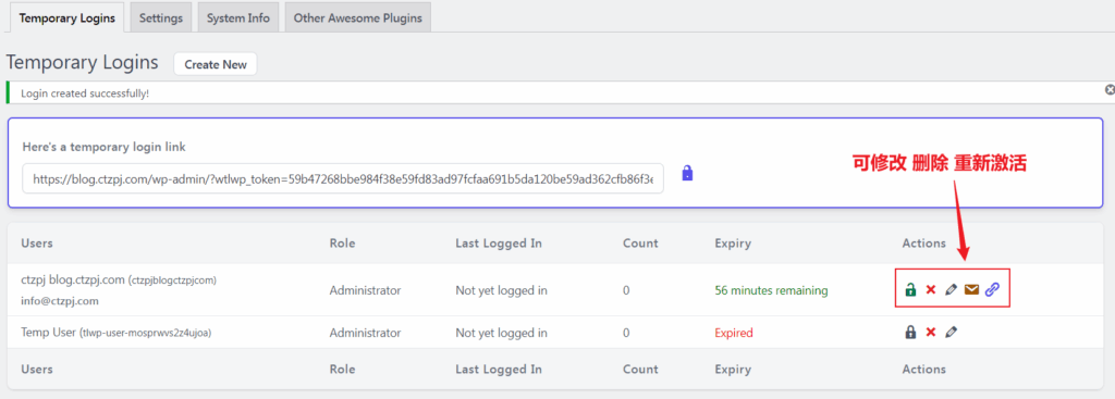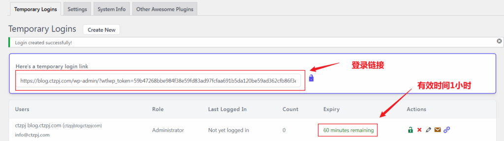 WordPress 创建后台权限临时开放插件 :Temporary Login Without Password 教程 当我们需要让他人短时间内协助处理网站问题、优化网站或者上传内容时,为了避免暴露原始密码,提高安全性与效率,我们该如何操作?今天跟大家分享一款实用的插件。 Temporary Login Without Password 是一款非常实用的 WordPress 插件,它允许你为他人(如技术人员、开发者或客户)创建一个临时账号链接,无需账号密码即可登录 WordPress 后台,并且可以设置过期时间与权限等级。 文章目录 Toggle 插件安装步骤使用方法详解创建临时登录链接新建用户方法分享登录链接查看与管理临时用户安全性提示常见用途和使用场景 插件安装步骤 登录 WordPress 后台 进入左侧菜单栏【插件】>【安装插件】 在搜索框输入:Temporary Login Without Password 点击【安装】并启用该插件 如果您还不会安装插件可以参考:WordPress插件安装教程 使用方法详解 创建临时登录链接 启用插件后,进入【用户】>【Temporary Logins】 插件会自动生成2个账户一个是管理员权限的Administrator 账户,一个是访客的User用户,如果您可以直接使用这2个账户,或者新建管理权限用户。 点击管理员账户右侧的小锁,使小锁成为打开状态 点击链接图标分享即可使用,(如需提前关闭账号,可点击小锁图标重新锁定) 新建用户方法 点击右上角的【Create New】按钮 填写以下信息: Email(邮箱):对方的联系邮箱 First Name(名字):可随意填写(例如“开发者”) Role(角色权限):建议选择“管理员”或“编辑者”,根据对方任务决定 Expiry(过期时间):可选1小时、1天、1周、1个月、自定义时间(这里我将选择1小时) 点击【Submit】后,将生成一个带有临时登录权限的链接 分享登录链接 将生成的链接复制后发给对方,对方无需输入用户名密码,点击即可登录后台。 查看与管理临时用户 您可以在【Temporary Logins】页面看到所有已创建的临时用户,包括创建时间、过期时间、登录状态、角色权限等。 您还可以手动: 提前删除某个临时用户 修改用户权限或延长使用时间 安全性提示 链接一旦过期,将无法继续使用,安全性较高 建议仅在信任的对象间使用,并及时删除不再需要的临时链接 避免设置过长的有效时间 常见用途和使用场景 找人调试网站时临时开放后台权限 请人修改主题或插件 临时添加内容人员无需创建新账号 客户预览后台管理界面 以后当我们找人维护或者处理问题时就可以不用提供账号密码了,即安全又省事!