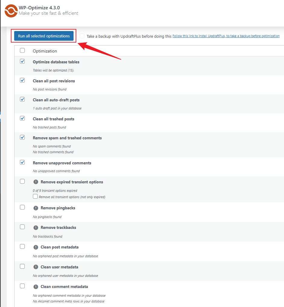 使用 WP-Optimize 优化你的 WordPress 数据库:网站加速与性能优化 随着我们网站运营时间增长,WordPress 数据库中会积累大量冗余数据,例如修订版本、自动草稿、垃圾评论、已删除文章等。这些无用数据不仅占用服务器的磁盘空间,还会拖慢网站加载速度。那么我们就需要用到数据库清理的插件了。推荐使用的是WP-Optimize这款 WordPress 插件。WP-Optimize 是一款功能强大且安全的数据库清理与优化插件,能帮助你一键提升网站性能。 文章目录 Toggle 为什么要优化 WordPress 数据库安装与启用 WP-Optimize 插件使用 WP-Optimize 进行数据库清理可清理的项目包括: 一键清理操作自动优化计划WP-Optimize 进阶功能优化时的注意事项 为什么要优化 WordPress 数据库 数据库是 WordPress 网站的核心。所有文章、页面、评论、设置都存储在数据库中。随着网站的日常使用,数据库会出现以下问题:文章修订版本过多:每次编辑文章都会生成一份修订记录。垃圾与已删除评论堆积:浪费空间,降低查询速度。过期的临时数据(transients):影响后台与缓存性能。未优化的表结构:数据表碎片增多,查询效率下降。通过 WP-Optimize 定期清理,可以让数据库保持轻量、快速、稳定,从而提升网站的速度。 安装与启用 WP-Optimize 插件 安装步骤:登录 WordPress 后台 → “插件” → “安装插件”。搜索 “WP-Optimize”。点击 “立即安装” → “启用”。启用后,在左侧菜单中找到 “WP-Optimize”。如何您还不会安装插件那么您可以查看下:WordPress插件安装教程直接通过WordPress后台安装WP-Optimize插件,也可以访问这里下载WP-Optimize插件。提示:WP-Optimize 插件官方插件由 UpdraftPlus 团队开发,安全可靠,兼容性良好。 使用 WP-Optimize 进行数据库清理 打开插件后,进入 “WP-Optimize → 数据库” 标签页,即可看到所有可优化项目:可清理的项目包括:已删除的文章、页面修订版本与自动草稿垃圾评论与待审核评论过期的临时缓存(transients)未使用的元数据优化数据库表结构 一键清理操作勾选需要清理的项目,点击 “运行优化(Run all selected optimizations)” 即可。建议:首次操作前先进行数据库备份,防止误删重要内容。网站备份插件推荐:All-in-One WP Migration 插件 自动优化计划 WP-Optimize 提供自动化清理功能,可按周期自动执行优化任务。设置步骤:进入 “WP-Optimize → 设置”。启用 “定期优化数据库” 选项。选择执行频率(每日、每周或每月)。保存设置即可。这能确保网站长期保持最佳性能,而无需手动维护。 WP-Optimize 进阶功能 除了数据库优化外,WP-Optimize 还具备以下高级功能:图片压缩:可无损压缩图片文件,减少页面加载时间。页面缓存:内置缓存功能,提升前端访问速度。延迟加载(Lazy Load):图片与脚本仅在需要时加载,进一步优化性能。Gzip 压缩与浏览器缓存设置:优化整体站点响应。这些功能结合使用,能显著提升网站的 Google PageSpeed 分数。当然了您也可以单独使用独立的如图片压缩插件、缓存插件等来优化网站速度。 优化时的注意事项 在优化前务必先备份数据库(All-in-One WP Migration)。不要频繁清理修订版本,否则可能丢失历史编辑记录,除非您确定不需要恢复到历史版本在操作。不要勾选“移除所有 transient 缓存”,除非您知道这些是什么缓存是干嘛用的。定期查看数据库大小,保持在合理范围内(一般小于 100MB 为佳)。 WP-Optimize 是一款轻量级、易用且高效的数据库优化插件。通过定期清理无用数据、压缩数据库表、启用缓存功能,你可以让 WordPress 网站运行得更快、更稳定。建议做法: 每月执行一次数据库清理,并结合缓存插件与 CDN 使用,可让网站性能提升 30% 以上。缓存插件推荐:WP Rocket 插件